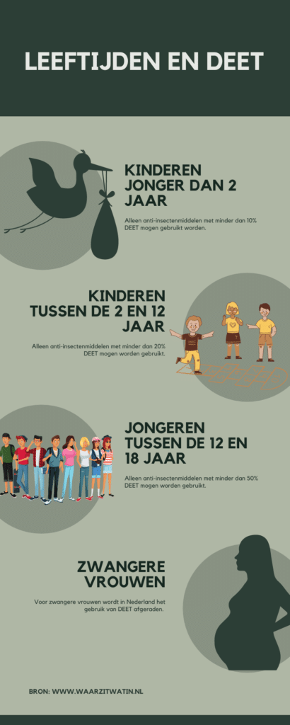 Voor doelgroepen zoals zwangere vrouwen, baby’s en (jonge) kinderen is er een mogelijk risico bij het gebruik van DEET. Zo wordt het gebruik van dit insectenafwerende middel afgeraden voor zwangere vrouwen in Nederland. Het zou kunnen zijn dat er andere richtlijnen gelden in landen waar muggen gevaarlijke ziekten overbrengen. Voor (jongere) kinderen en baby’s is het ook belangrijk om goed te kijken naar het percentage DEET dat in het anti-insectenmiddel zit, dit omdat hoge concentraties van de stof niet geschikt zijn. Bekijk daarom ook altijd de gebruiksaanwijzing bij de verpakking.
